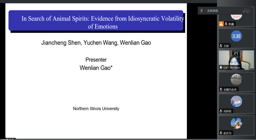 2023年12月15日上午,北伊利诺伊大学(Northern Illinois University)助理教授高文莲(Wenlian Gao)老师应邀做客海角app 泰山学术训练营并做了题为“In Search of Animal Spirits: Evidence From Idiosyncratic Volatility of Emotions”的学术报告。会议由海角app 副院长王营教授主持,海角app 部分教师和学生参加了此次会议。
