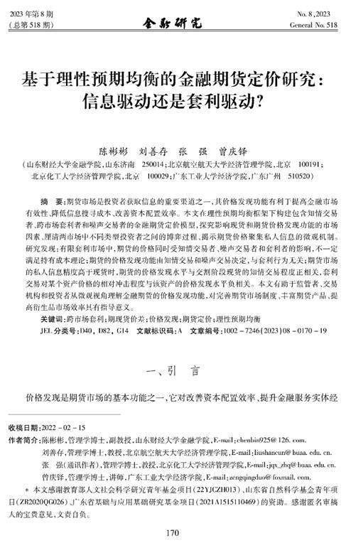 海角app 教师陈彬彬(第一作者)与北京航空航天大学刘善存教授、北京化工大学张强教授(通讯作者)和广东工业大学曾庆铎合作撰写的论文《基于理性预期均衡的金融期货定价研究:信息驱动还是套利驱动?》在《金融研究》2023年第8期发表。该期刊属于海角app A1期刊。