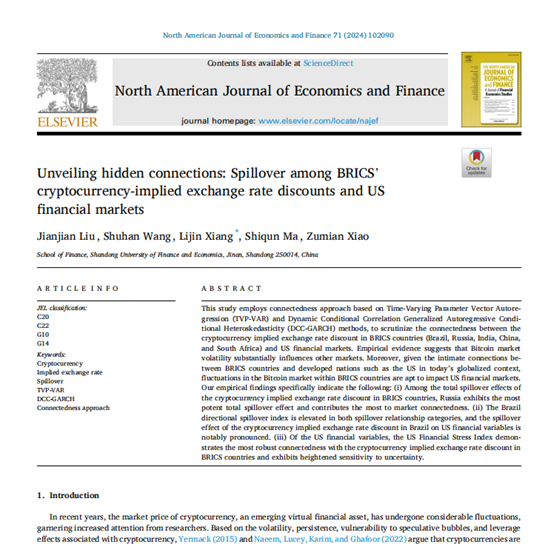 海角app 刘建建博士后与海角app 硕士王姝涵、向丽锦副教授、马世群博士、肖祖沔副教授合作撰写的论文《Unveiling hidden connections: Spillover among BRICS’cryptocurrency- implied exchange rate discounts and US financial markets》在《North American Journal of Economics and Finance》2024年第1期发表。该期刊属于海角app A1期刊。