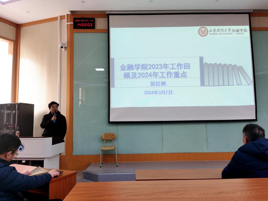 院长彭红枫总结了学院2023年的工作成绩和不足,教学方面取得了优异的成绩,主要包括“金融学教师团队”入选第三批“全国高校黄大年式教师团队。顺利完成了本科教学审核评估的各项工作。《金融学》(线下)课程被教育部认定为第二批国家级一流本科课程,学院目前共有4门国家级一流本科课程和4门山东省一流本科课程。“金融开放与风险防控导学团队”入选2023年度山东省优秀研究生导学团队。与中泰证券等单位成立共建现代金融产教融合共同体、与鲁信集团共建现代产业学院等;科研方面:学院主办了第二十二届(2023年)中国金融工程学年会暨“金融创新与高质量发展”学术会议等三个全国性学术会议。学院教师获批2项国家社科基金项目立项,1项国家自然科学基金项目立项,1项教育部人文社会科学研究项目,4项山东省社科规划研究项目,2项山东省自然科学基金项目。高质量学术发表数量稳步增长,学院教师累计发表B类及以上论文60余篇,其中A类论文30余篇。出版专著《全球资本账户双向开放再测度及其经济效应》,该著作入选2022年度《国家哲学社会科学成果文库》。学院教师指导学生在挑战杯、三千计划、“互联网+”大学生创新创业大赛等取得多项的荣誉,学院工会工作也得到了学校的表彰。彭红枫提出了今年的工作目标和思路:一是继续开展国家“两金”和教育部项目的申报辅导,做好学院标志性研究成果的培育,开展有组织的科研活动,使成果质量进一步提升;二是积极鼓励青年教师申报各类人才工程项目,学院将为申报工作做好服务,力争在高水平人才队伍方面再有突破;三是加强本科学生全过程培养质量跟踪,培育创新有特色的人才培养模式,落实本科生专业教师导师制度,加强对本科生的专业指导;四是推动学院社会服务、校友等方面工作开展,鼓励广大教师积极参与学院的培训工作,学院在政策方面予以支持。