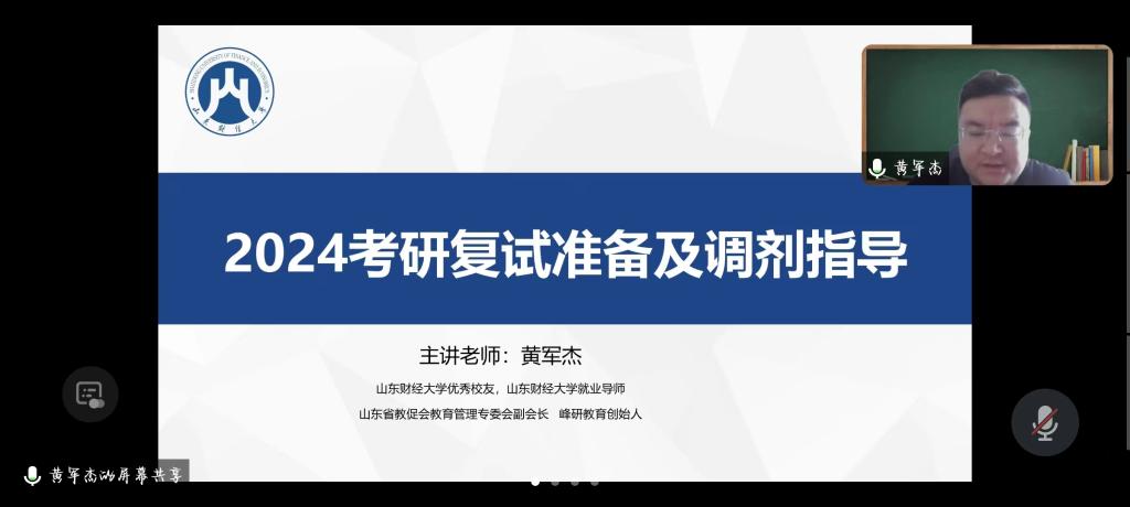 为帮助需要调剂的考生提供及时、有效的信息和服务,帮助学生全面了解掌握复试、调剂流程和方法,提升2024届考研成功率,2024年3月8日下午我院召开了关于“2024考研复试及调剂指导”专题讲座,并邀请海角app 就业导师、海角app 优秀校友、山东教促会教育管理专委会副会长黄军杰老师担任主讲嘉宾。
