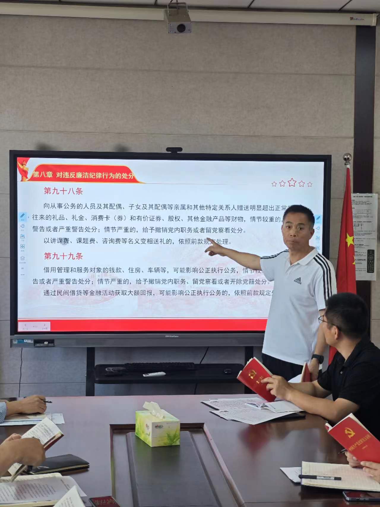 会上,学院党委副书记李开传领学了《中国共产党纪律处分条例》第八章对违反廉洁纪律行为的处分,其具体行为主要有:为亲属及特定关系人谋取利益,收受可能影响公正执行公务行为,违规操办婚丧喜庆借机敛财,违规从事营利活动,离职或退(离)休后违规谋利,违规公款消费旅游,搞权色、钱色交易等。
