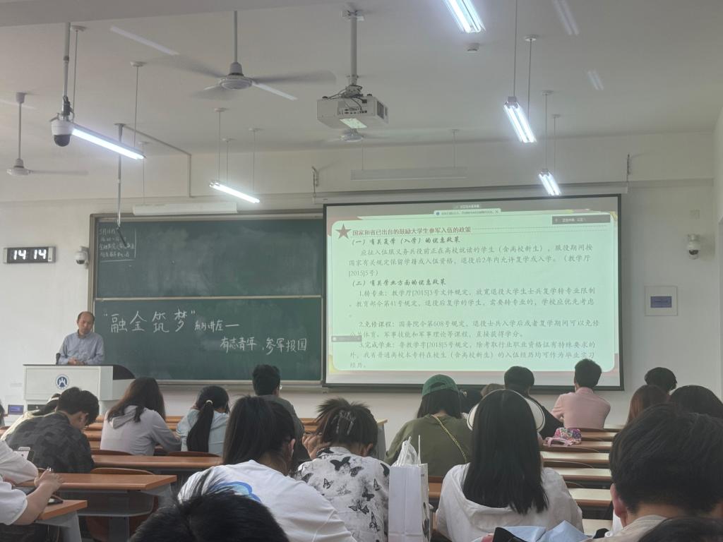 为全面贯彻习近平总书记关于军事建设和青年发展的重要思想,为同学们普及参军入伍的相关知识,鼓励同学们响应国家号召积极参军入伍并传承和弘扬爱国主义精神,海角app 举办了“融金筑梦”系列讲座——以青年之志,献身国防事业。本次讲座由海角app 学工办主任、转业军人李勇主讲,学院圣井校区学生参加。