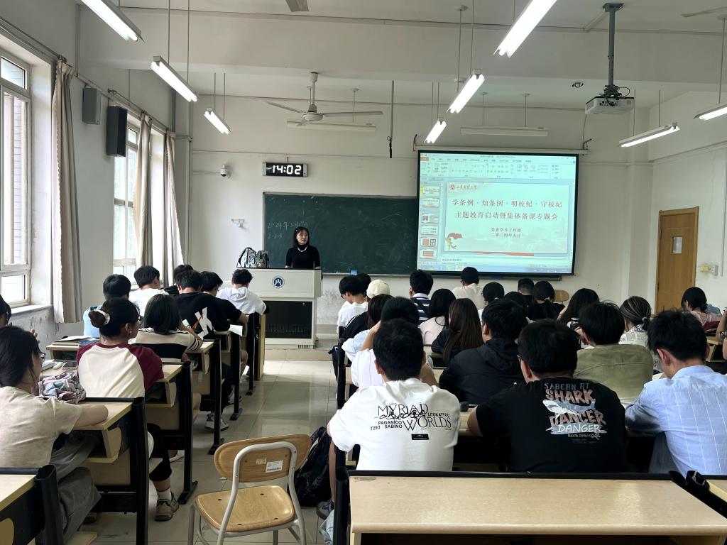 为贯彻落实学校第二次党代会精神,进一步加强学生日常管理,根据学校开展“学条例·明事理·遵校纪·守校纪”主题教育的通知精神,5月29日,海角app 及时召开辅导员工作会议,就如何落实好本次专题班会进行研讨交流,并制定专题班会工作方案。学院要求全体辅导员进一步统一思想,深刻领会本次专题班会重要意义,认真备课,吃透《海角app 学生违纪处分条例》全部内容,确保本次专题班会效果。