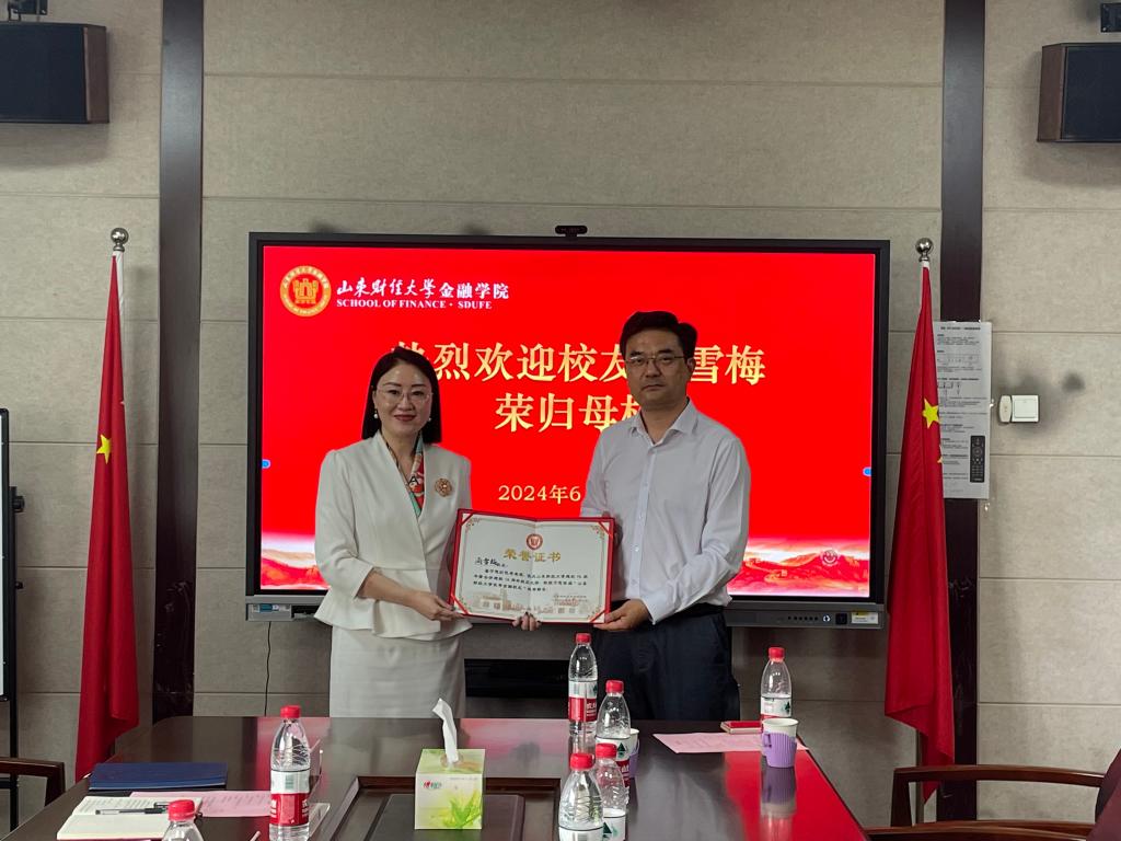 商雪梅表达了重返校园的澎湃心情,回忆了自己的校园岁月。接着,她介绍了其集团的概况和主营领域,并表明愿意为母校学生提供实践契机,助力学生成长成才。她表示,将充分利用自己在金融行业的资源和经验,为学院的发展贡献力量。