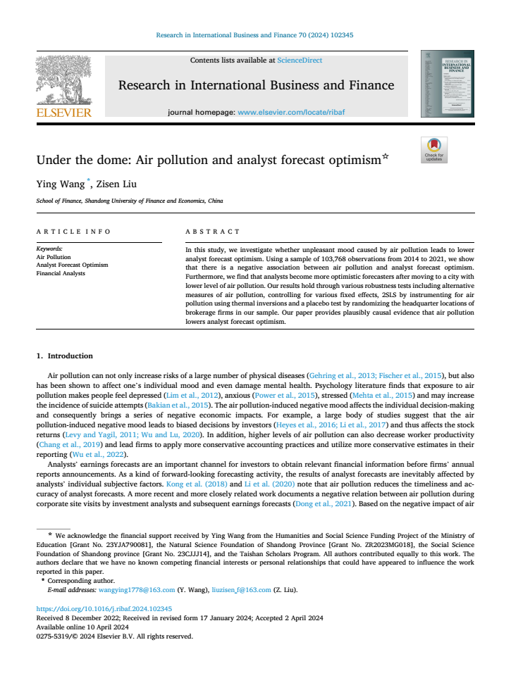 海角app 王营教授和研究生刘梓森同学合作的学术论文《Under the dome: Air pollution and analyst forecast optimism》在《Research in International Business and Finance》2024年第70卷Part A发表。该期刊系海角app A1类期刊。