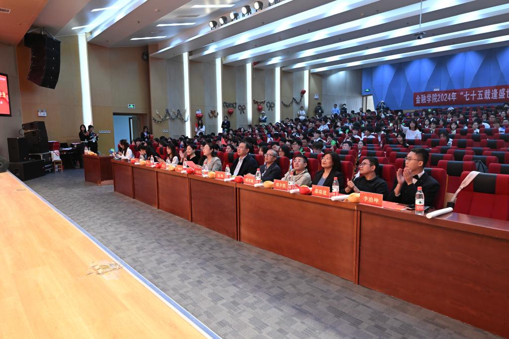 比赛现场气氛热烈,掌声、欢呼声此起彼伏,各参赛队用嘹亮的歌声祝福祖国,用激昂的旋律展现金融学子的时代风采。