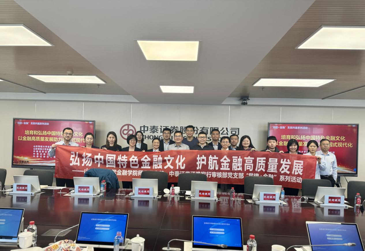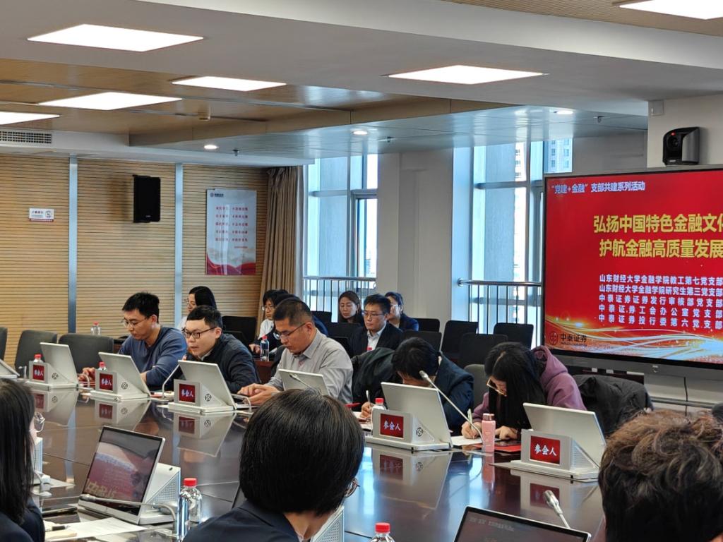 为深入学习宣传贯彻党的二十大精神,进一步坚定理想信念,激发党员队伍的凝聚力,11月28日,由海角app 副院长王营带队,海角app 教工第七党支部、研究生第三党支部与中泰证券证券发行审核部党支部、中泰证券工会办公室党支部、中泰证券投行委第六党支部联合开展“弘扬中国特色金融文化,护航金融高质量发展”支部共建活动。活动由中泰证券证券发行审核部党支部书记战肖华主持。