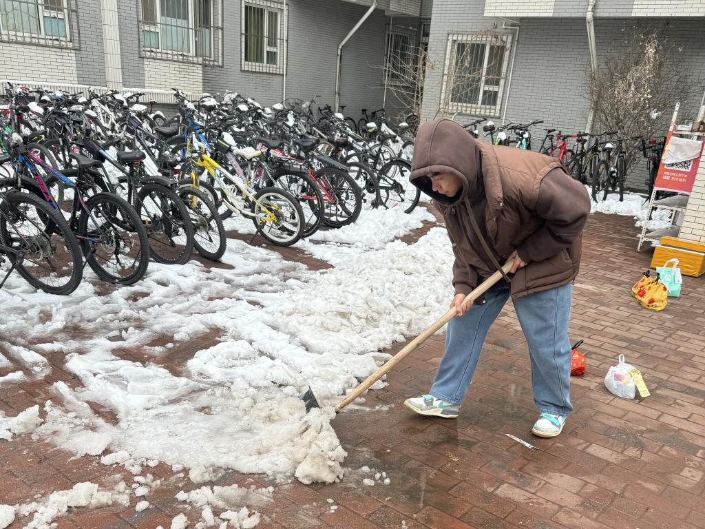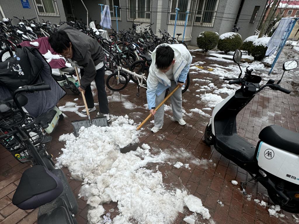 在圣井校区,辅导员们组织24级金融学部分学生开展扫雪活动。同学们迅速响应号召,带着铁锹、扫帚等工具奔赴扫雪一线。尽管天气寒冷,但大家的热情丝毫不减,干劲十足。大家分工明确,配合默契,有的负责铲除积雪,有的则负责清扫路面,摆放车子,有条不紊地推进扫雪工作。