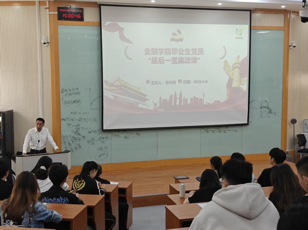 李开传结合党中央相关法规及典型案例,系统地阐释了党的十八大以来党中央反腐败斗争的高压态势。随后,他对即将踏上社会的青年党员提出四点殷切期望:一是在平凡中坚定理想信念。他勉励青年党员既要胸怀远大理想,更要肩扛使命担当。苔花如米小,也学牡丹开。党员同志要主动摒弃平庸心态,在平凡岗位上书写不凡篇章。二是在平和中追求卓越幸福。身为党员要筑牢廉洁自律防线,恪守自我底线,在实干中提升本领,在奋斗中展示风采。三是在平静之中担当时代大任。青年党员要以“功成不必在我”的精神境界和“功成必定有我”的历史担当,脚踏实地锤炼本领,在奉献中成就人生价值。四是在平常中永葆党员本色。一个党员就是一面旗帜,身为青年党员要永葆党员本色,真正发挥先锋模范作用,用实际行动诠释共产党员的忠诚、干净、担当。最后,李开传向毕业生党员们表达了自己的祝愿,期待每一位金融学子都能够学有所成,并希望大家能够常回“家”看看。