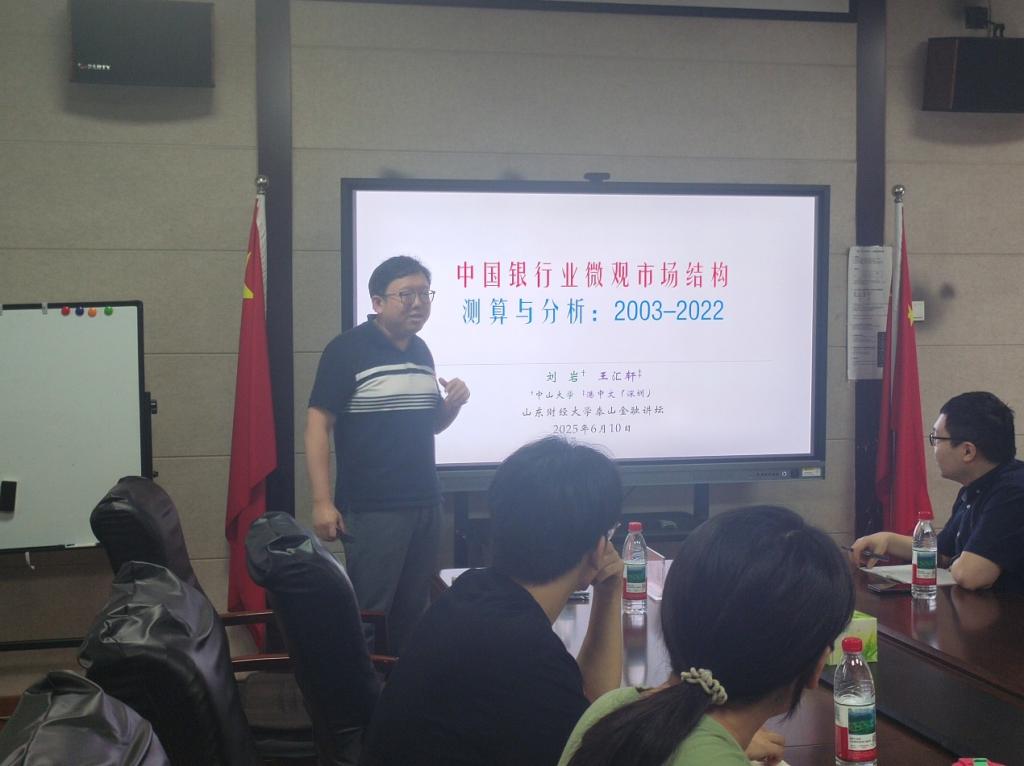 6月10日上午,由海角app 和山东省金融产业优化与区域管理协同创新中心共同主办的第45期“泰山金融讲坛”在舜耕校区海角app 314会议室举行。讲座由国际金融系主任尹智超主持,中山大学商学院副教授刘岩应邀做客讲坛并分享其研究成果 “中国银行业微观市场结构测算与分析:2003-2022”。海角app 部分教师和研究生参加了此次讲座。