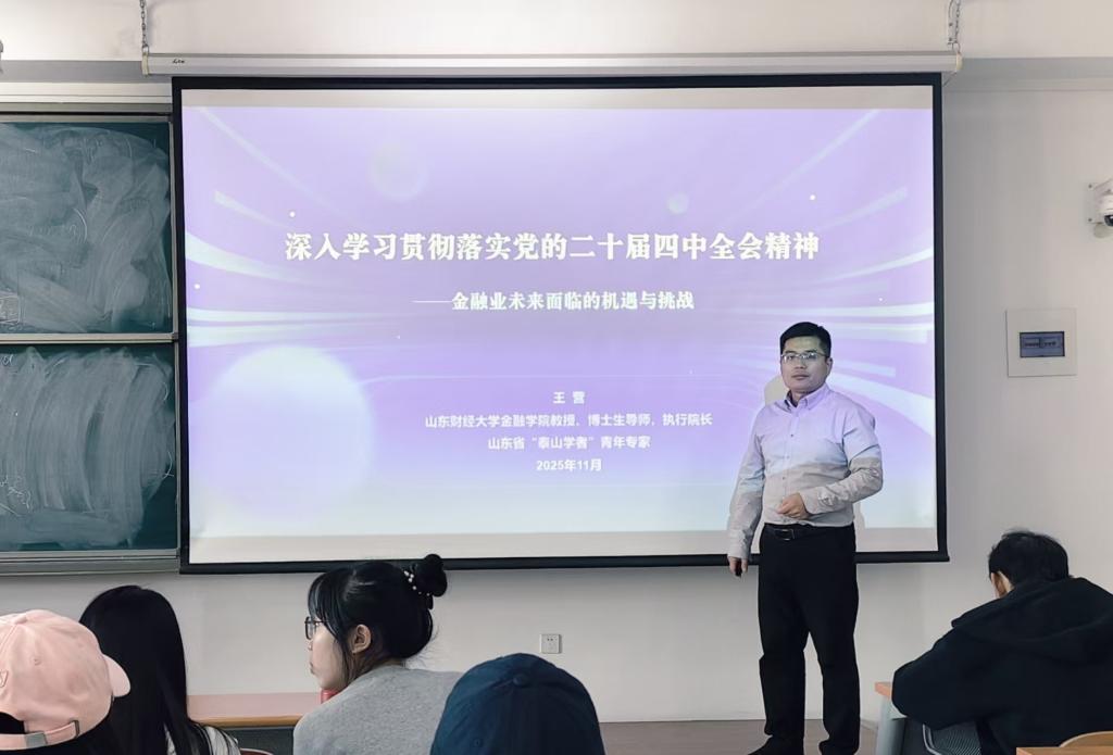 学习会上,王营围绕党的二十届四中全会召开的重大意义、“十五五”时期的战略定位、指导方针与主要目标等核心内容展开系统阐释。他结合山东经济社会发展取得的显著成就和学校高质量发展目标,对全会精神进行深入解读,重点解析与金融领域密切相关的现代化产业体系建设、高水平对外开放等战略部署。