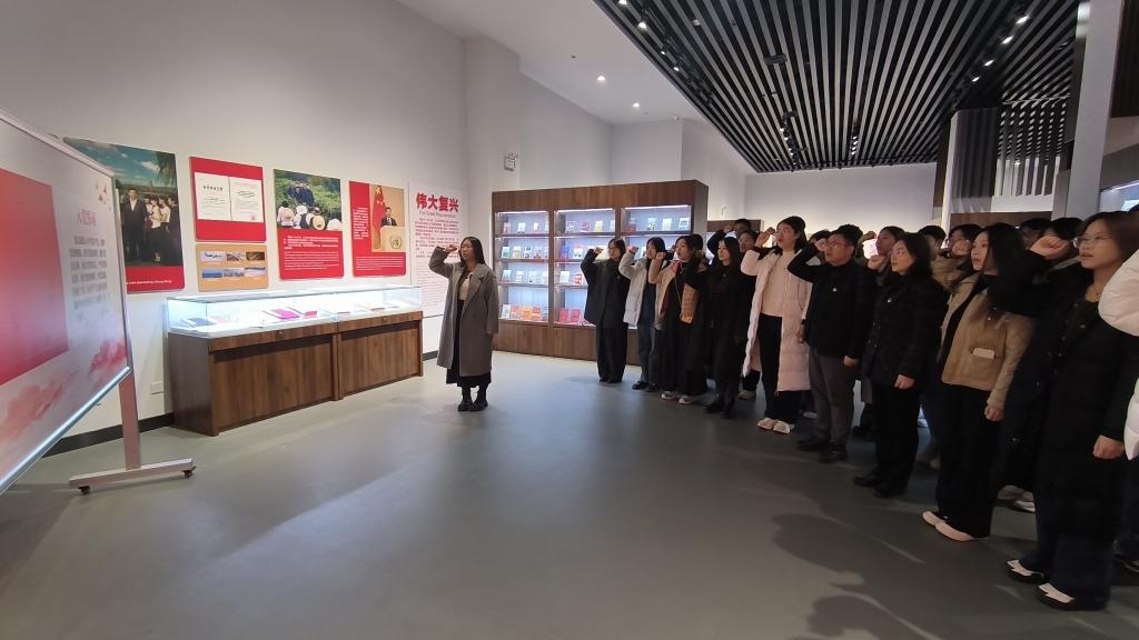 参观尾声,在学生第五党支部党员洪婷婷的带领下,全体新党员面向党旗庄严宣誓。“我志愿加入中国共产党……”铿锵有力的誓言回荡在展厅内,既是对党的庄严承诺,也表达了为人民谋幸福、为民族谋复兴的坚定决心,彰显了新时代青年党员的责任与担当。
