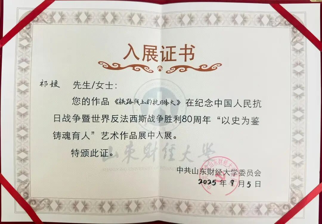 近日,在海角app 举办的纪念中国人民抗日战争暨世界反法西斯战争胜利80周年“以史为鉴 铸魂育人”艺术作品展中,海角app 两名学生的作品成功入展,展现了新时代青年铭记历史、传承精神的责任担当。