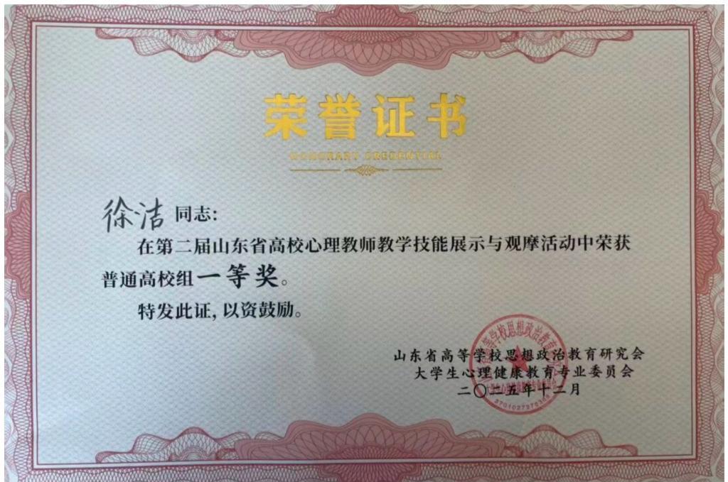 12月3日至5日,山东省大学生心理健康教育专业委员会2025年年会暨第二届高校心理教师教学技能展示与观摩活动在山东理工大学举办。我院教师徐洁荣获心理教师教学技能展示与观摩活动决赛(普通高校组)一等奖。我院王亚男老师指导的由2024级金融专硕2班徐云涛主讲作品《向内生长向外绽放》荣获2025年山东省高校心理健康教育月心理健康教育主题班会三等奖。