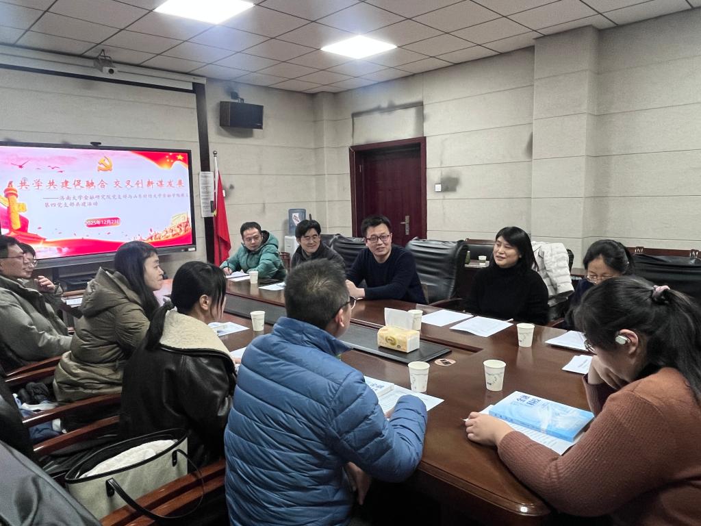 首先,两院支部书记简单介绍了各自支部建设情况。教工第四党支部书记陈彬彬强调,支部共建是破解党建业务“两张皮”的关键举措,希望通过本次跨校的支部共建探索,将党建工作与业务工作深度融合。他指出,党支部坚持以“党建+”模式引领学科建设、教学科研与人才培养,形成了“政治引领、业务融合、师生联动”的特色机制。济南大学金融研究院党支部书记翟坤则从支部标准化建设、党员作用发挥等方面分享了经验,并重点介绍了研究院在党建引领下,围绕金融工程、数字金融等方向开展的系列前沿研究与社会服务成果。双方一致认为,支部共建不仅是组织生活的创新,更是推动资源互通、优势互补、发展互助的战略平台。