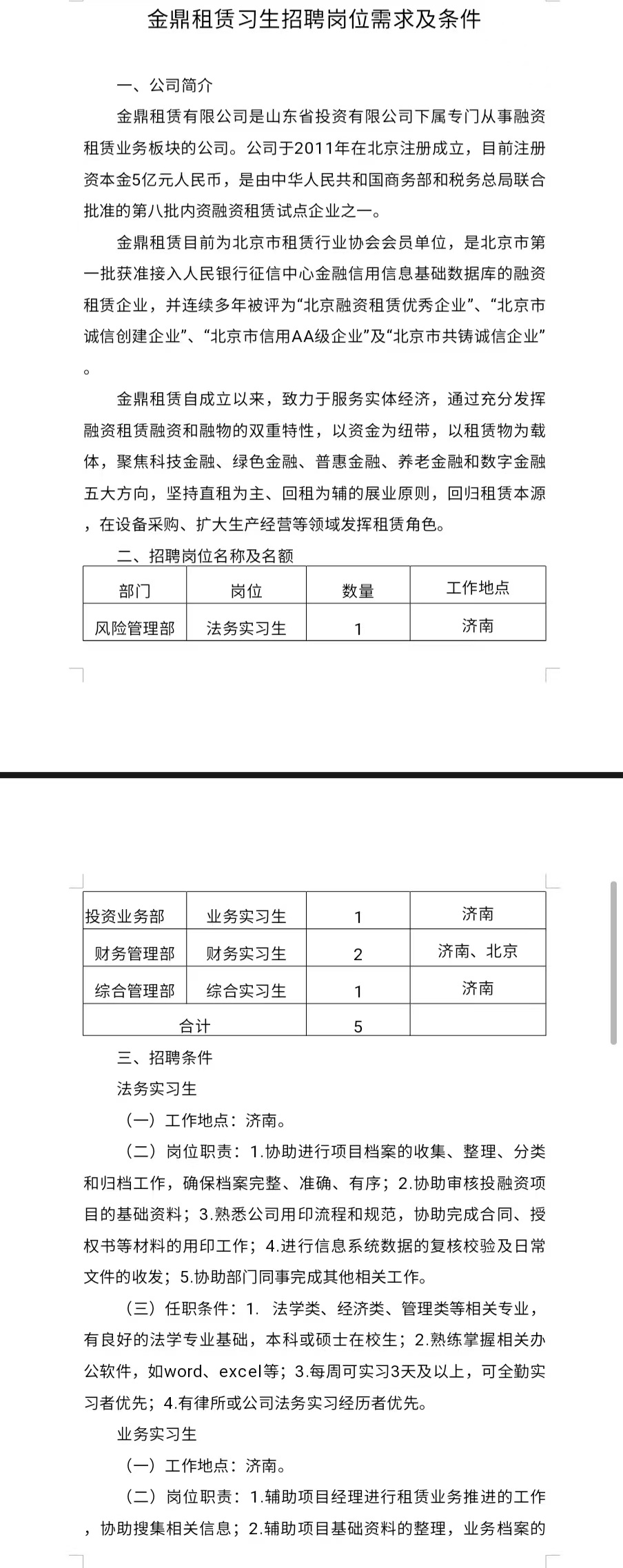 金鼎租赁实习生招聘岗位需求及条件