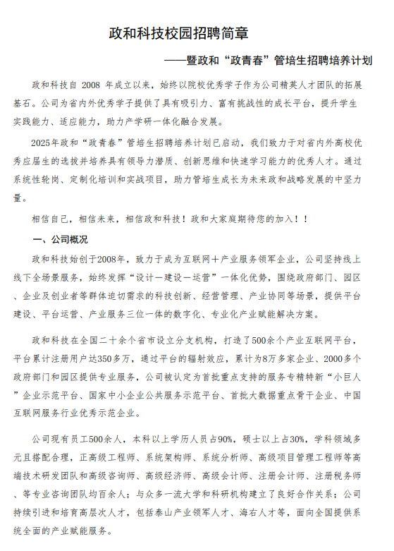 政和科技校园招聘简章|暨政和“政青春”管培生招聘培养计划