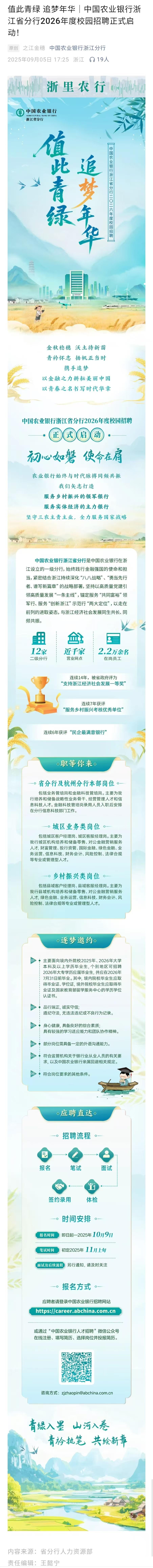 值此青绿 追梦年华|中国农业银行浙江省分行2026年度校园招聘正式启动!