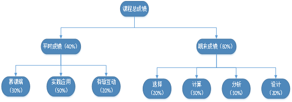 ⒉平时成绩=慕课学习、测评、考试(30%)+实践应用(50%)+课堂互动(20%)。